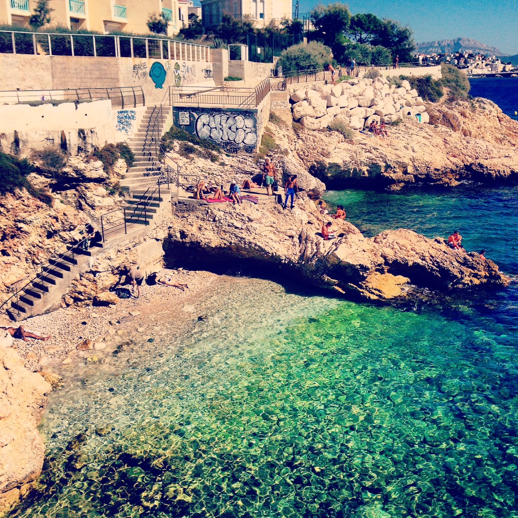 Le bord de mer tout le long de la Corniche offre également une multitude de sublimes calanques. Vous aurez l’impression d’être isolé du monde tout en étant en plein centre ville (la magie de Marseille que beaucoup de villes nous envient). Malheureusement les calanques sont difficilement accessibles pour les PMR car elles sont composées de rochers. A moins d’être une chèvre, il est particulièrement difficile d’y accéder. Pourtant quelques unes d’entre elles possèdent parfois un escalier permettant d’accéder à une petite plage de graviers. D’ailleurs je ne saurais trop vous conseiller de ne pas y marcher pieds nus, mais plutôt de vous munir de chaussures types méduses, aquashoes ou tongs. Ce sera plus confortable et plus stable pour profiter du lieu.